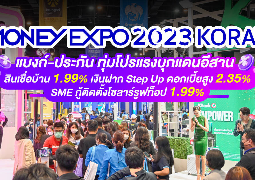 11 September 2023MONEY EXPO 2023 KORAT แบงก์-ประกัน ทุ่มโปรแรงบุกแดนอีสาน สินเชื่อบ้าน 1.99% เงินฝาก Step Up ดอกเบี้ยสูง 2.35%SME กู้ติดตั้งโซลาร์รูฟท็อป 1.99%