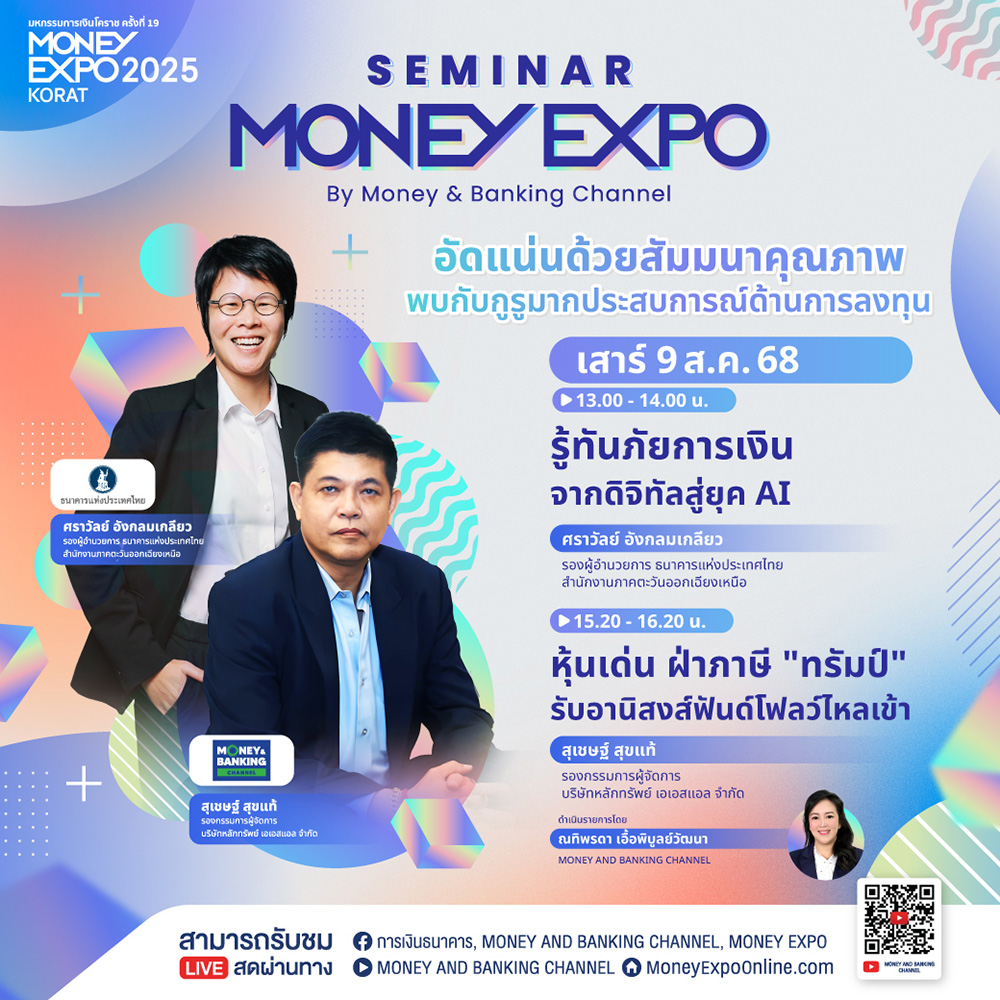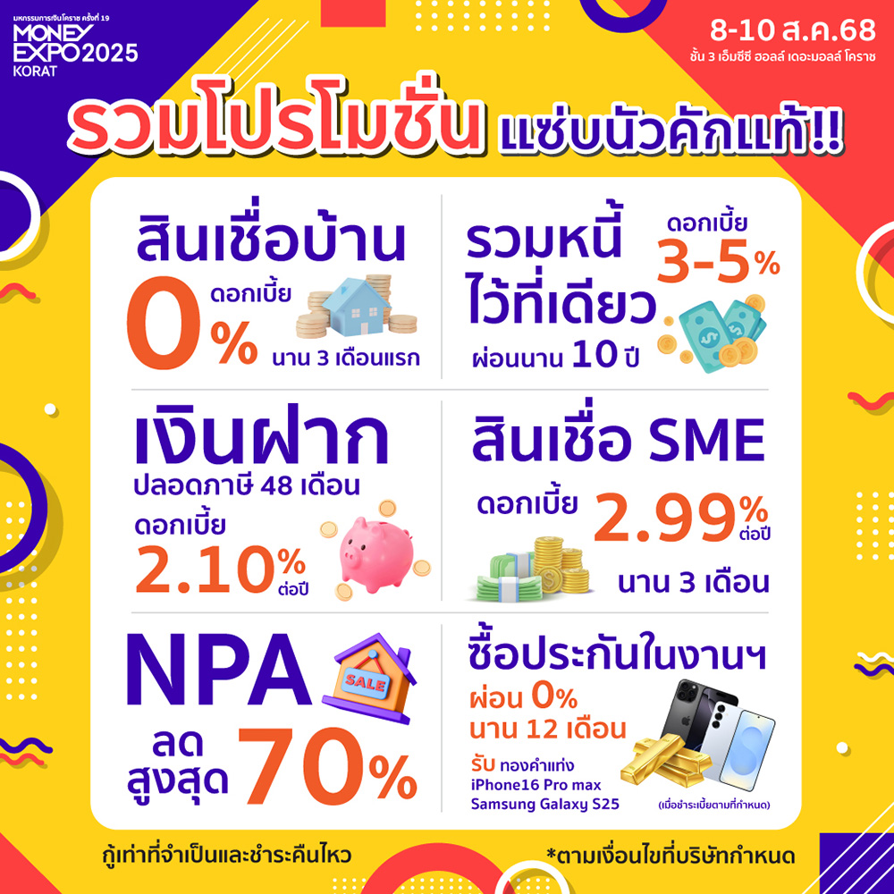 เปิดฉากอย่างยิ่งใหญ่ งานมหกรรมการเงินโคราช ครั้งที่ 19 MONEY EXPO 2025 KORAT แบงก์-นอนแบงก์-บล.-บลจ.-ประกัน อัดแน่นบริการทางการเงินการลงทุนครบจบในที่เดียว พร้อมเสิร์ฟโปรโมชั่นพิเศษ สินเชื่อบ้าน ดอกเบี้ย 0% นาน 3 เดือน เงินฝากปลอดภาษี 48 เดือน ดอกเบี้ย 2.10% ต่อปี NPA ทำเลทอง ลดสูงสุด 70% สินเชื่อธุรกิจ SME ดอกเบี้ย 2.99% ต่อปี นาน 3 เดือน รวมหนี้ไว้ที่เดียว ดอกเบี้ยต่ำ 3-5% ผ่อนนาน 10 ปี ซื้อประกันในงาน ผ่อน 0% นาน 12 เดือน รับทองคำแท่ง, iPhone16 Pro max, Samsung Galaxy S25 ฟังฟรี! สัมมนาหัวข้อ “รู้ทันภัยการเงินจากดิจิทัลสู่ยุค AI” และ “หุ้นเด่นฝ่าภาษี “ทรัมป์” รับอานิสงส์ฟันด์โฟลว์ไหลเข้า” พร้อมความบันเทิงสุดม่วนกับ “ท็อป นรากร” วันที่ 8-10 สิงหาคม 2568 ณ เอ็มซีซี ฮอลล์ ชั้น 3 ห้างสรรพสินค้า เดอะมอลล์ โคราช จังหวัดนครราชสีมา