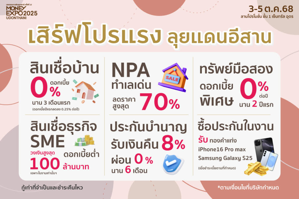 งานมหกรรมการเงินอุดรธานี ครั้งที่ 12 MONEY EXPO 2025 UDONTHANI จัดขึ้นอย่างคึกคัก ณ ลานโปรโมชั่น ชั้น 1 ศูนย์การค้าเซ็นทรัล อุดร จังหวัดอุดรธานี ระหว่างวันที่ 3-5 ตุลาคม 2568 ธนาคาร-นอนแบงก์-ประกัน-บล.-บลจ. ขนโปรโมชั่นสุดร้อนแรงมอบให้พี่น้องชาวอุดรธานีและภาคอีสานตอนบน สินเชื่อบ้านดอกเบี้ย 0% นาน 3 เดือน, NPA ทำเลเด่นลดสูงสุด 70%, สินเชื่อ SME วงเงินสูงสุด 100 ล้านบาท ซื้อประกันในงานรับ iPhone16 Pro Max / Samsung Galaxy S25