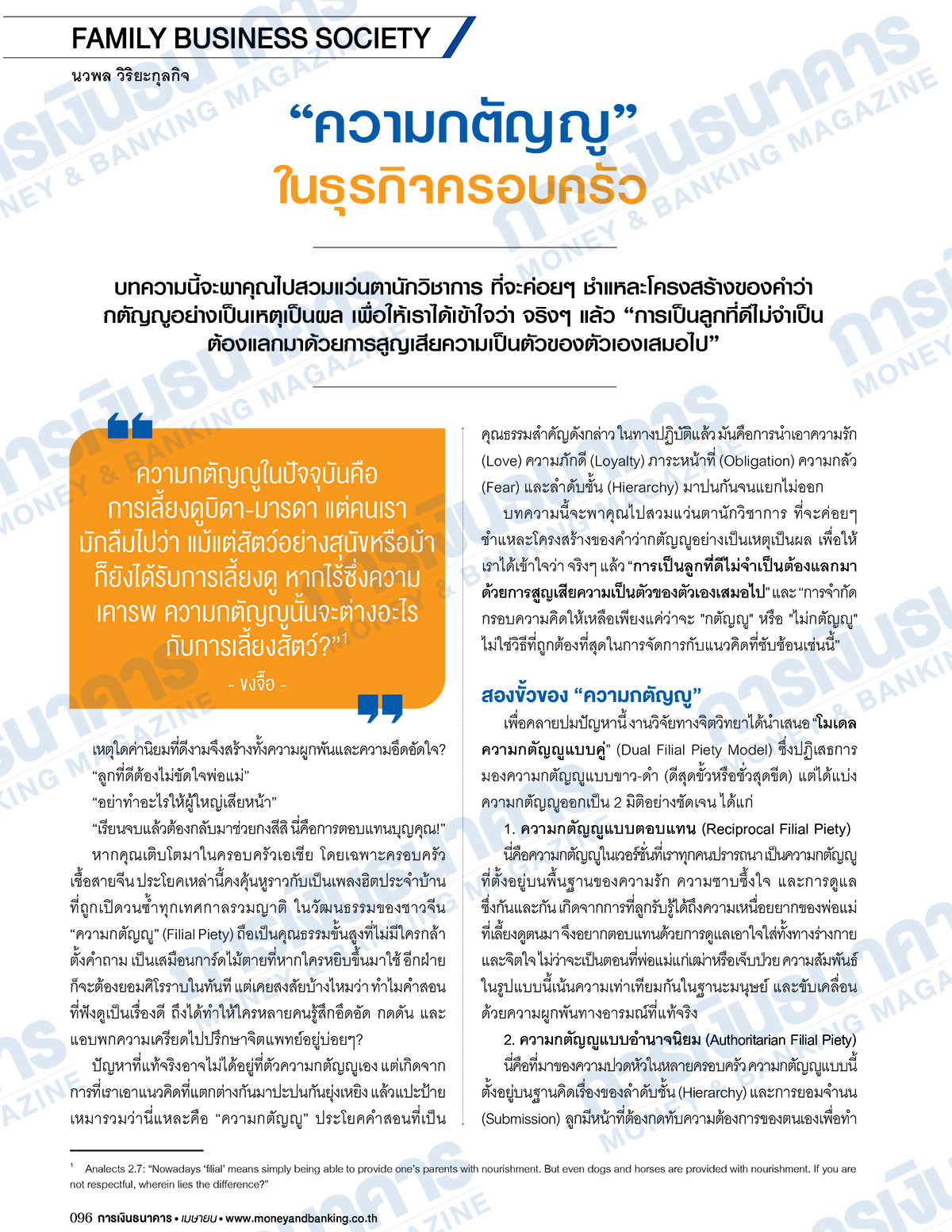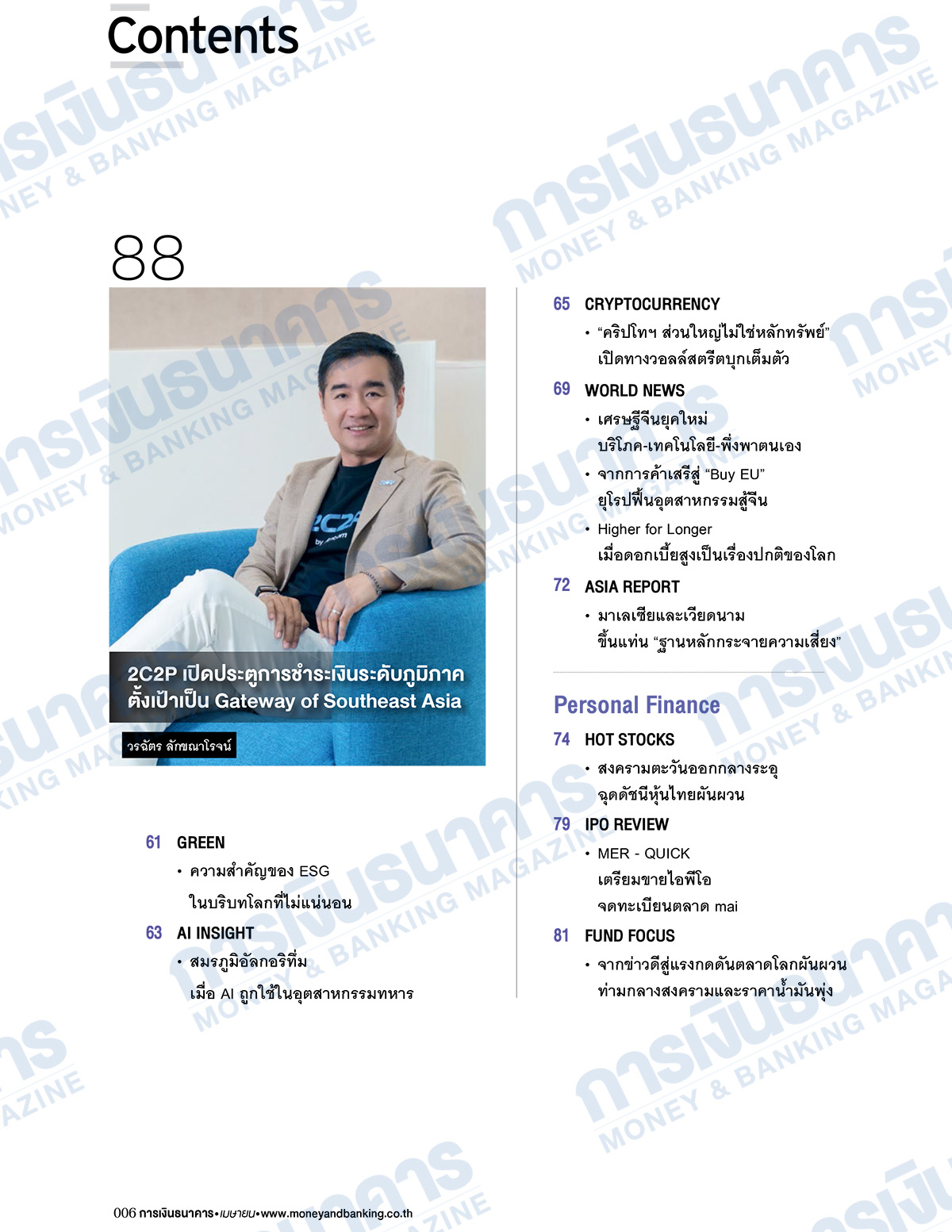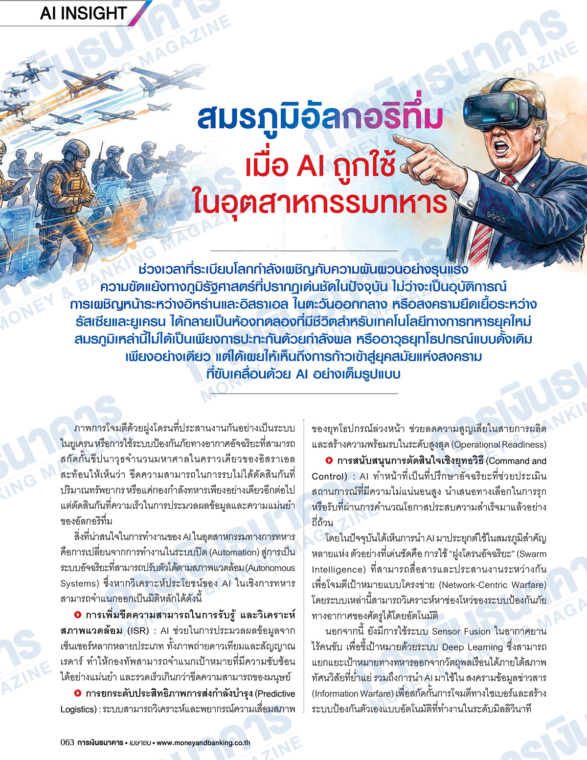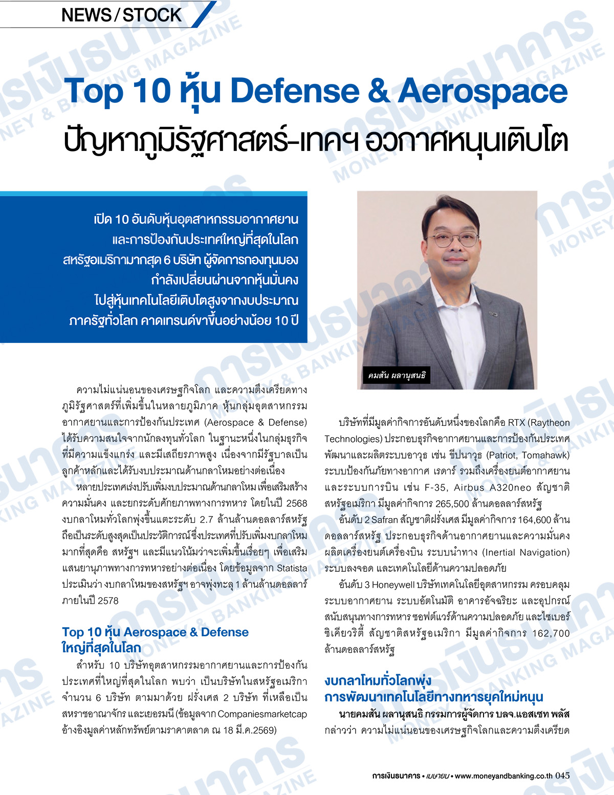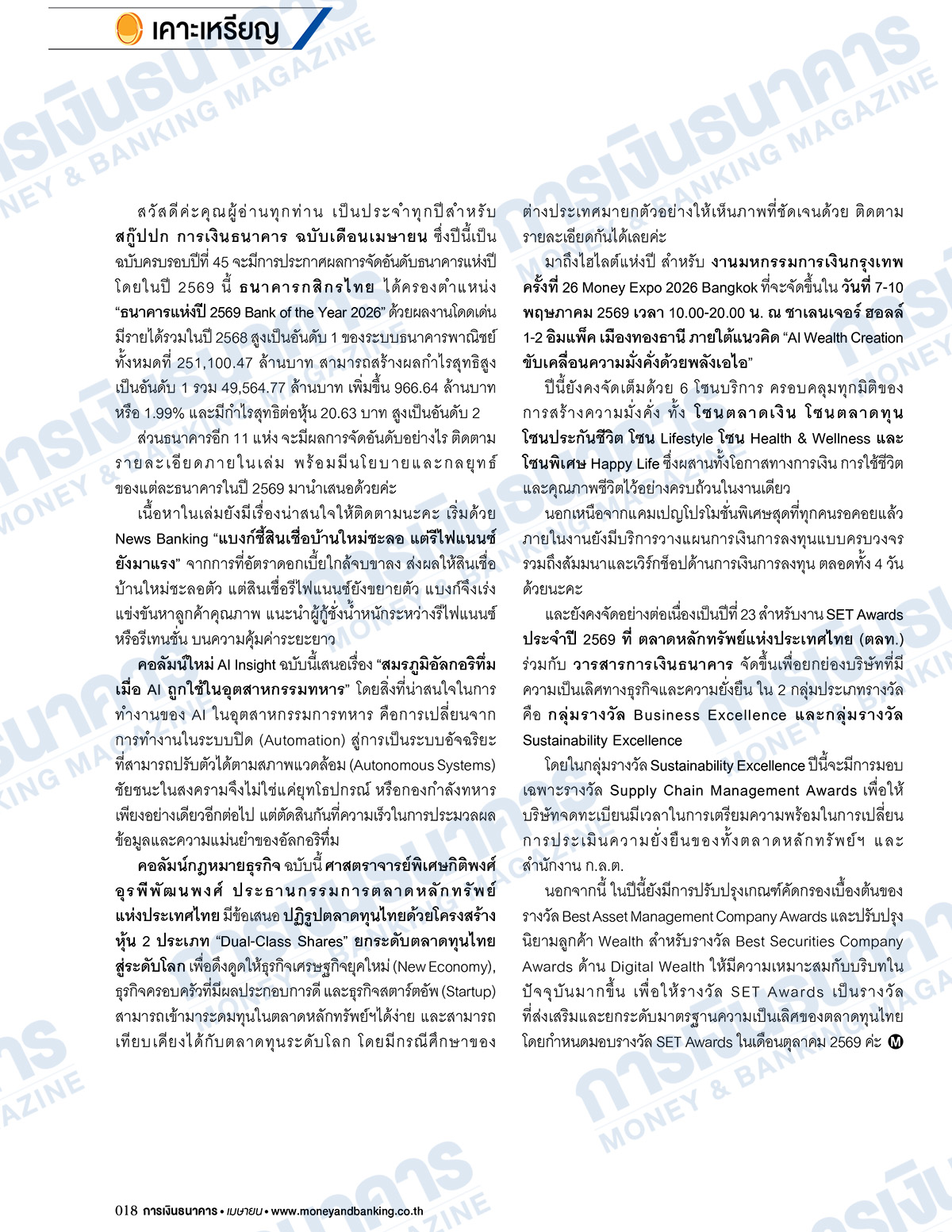 วารสารการเงินธนาคาร ฉบับเดือนเมษายน 2569 นำเสนอ สกู๊ปปก “ธนาคารแห่งปี 2569 Bank of the Year 2026” โดย ธนาคารกสิกรไทย ครองตำแหน่งด้วยผลงานโดดเด่น รายได้รวมปี 2568 สูงเป็นอันดับ 1 ของระบบธนาคารพาณิชย์ทั้งหมด ที่ 251,100.47 ล้านบาท สร้างผลกำไรสุทธิสูงเป็นอันดับ 1 รวม 49,564.77 ล้านบาท เพิ่มขึ้น 1.99% กำไรสุทธิต่อหุ้น 20.63 บาท สูงเป็นอันดับ 2 ส่วนธนาคารอีก 11 แห่ง จะมีผลการจัดอันดับอย่างไร ติดตามรายละเอียดภายในเล่ม คอลัมน์ใหม่ AI Insight เสนอเรื่อง “สมรภูมิอัลกอริทึ่ม เมื่อ AI ถูกใช้ในอุตสาหกรรมทหาร” สิ่งที่น่าสนใจในการทำงานของ AI ในอุตสาหกรรมการทหาร คือเปลี่ยนจากการทำงานในระบบปิด สู่ระบบอัจฉริยะที่ปรับตัวได้ตามสภาพแวดล้อม ชัยชนะในสงครามจึงไม่ใช่แค่ยุทโธปกรณ์ หรือกองกำลังทหารเพียงอย่างเดียว แต่ตัดสินกันที่ความเร็วในการประมวลผลข้อมูล และความแม่นยำของอัลกอริทึ่ม ต่อด้วย คอลัมน์กฎหมายธุรกิจ ศ.(พิเศษ) กิติพงศ์ อุรพีพัฒนพงศ์ ประธานกรรมการ ตลท. มีข้อเสนอ ปฏิรูปตลาดทุนไทย ด้วยโครงสร้างหุ้น 2 ประเภท “Dual-Class Shares” ยกระดับตลาดทุนไทยสู่ระดับโลก เพื่อดึงดูดธุรกิจเศรษฐกิจยุคใหม่, ธุรกิจครอบครัวที่มีผลประกอบการดี และธุรกิจสตาร์ตอัพ เข้ามาระดมทุนในตลาดหลักทรัพย์ฯ ได้ง่าย เทียบเคียงตลาดทุนระดับโลก