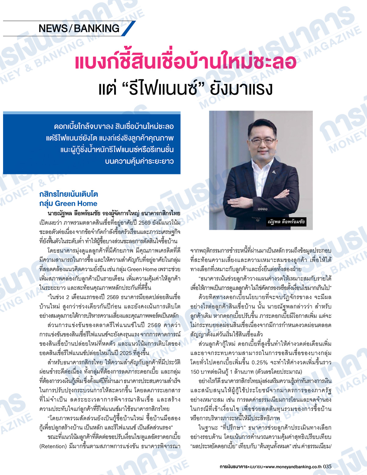 - News Banking : “แบงก์ชี้สินเชื่อบ้านใหม่ชะลอ แต่รีไฟแนนซ์ยังมาแรง” จากการที่อัตราดอกเบี้ยใกล้จบขาลง ส่งผลให้สินเชื่อบ้านใหม่ชะลอตัว แต่สินเชื่อรีไฟแนนซ์ยังขยายตัว แบงก์จึงเร่งแข่งขันหาลูกค้าคุณภาพ แนะนำผู้กู้ชั่งน้ำหนักระหว่างรีไฟแนนซ์หรือรีเทนชั่นบนความคุ้มค่าระยะยาว