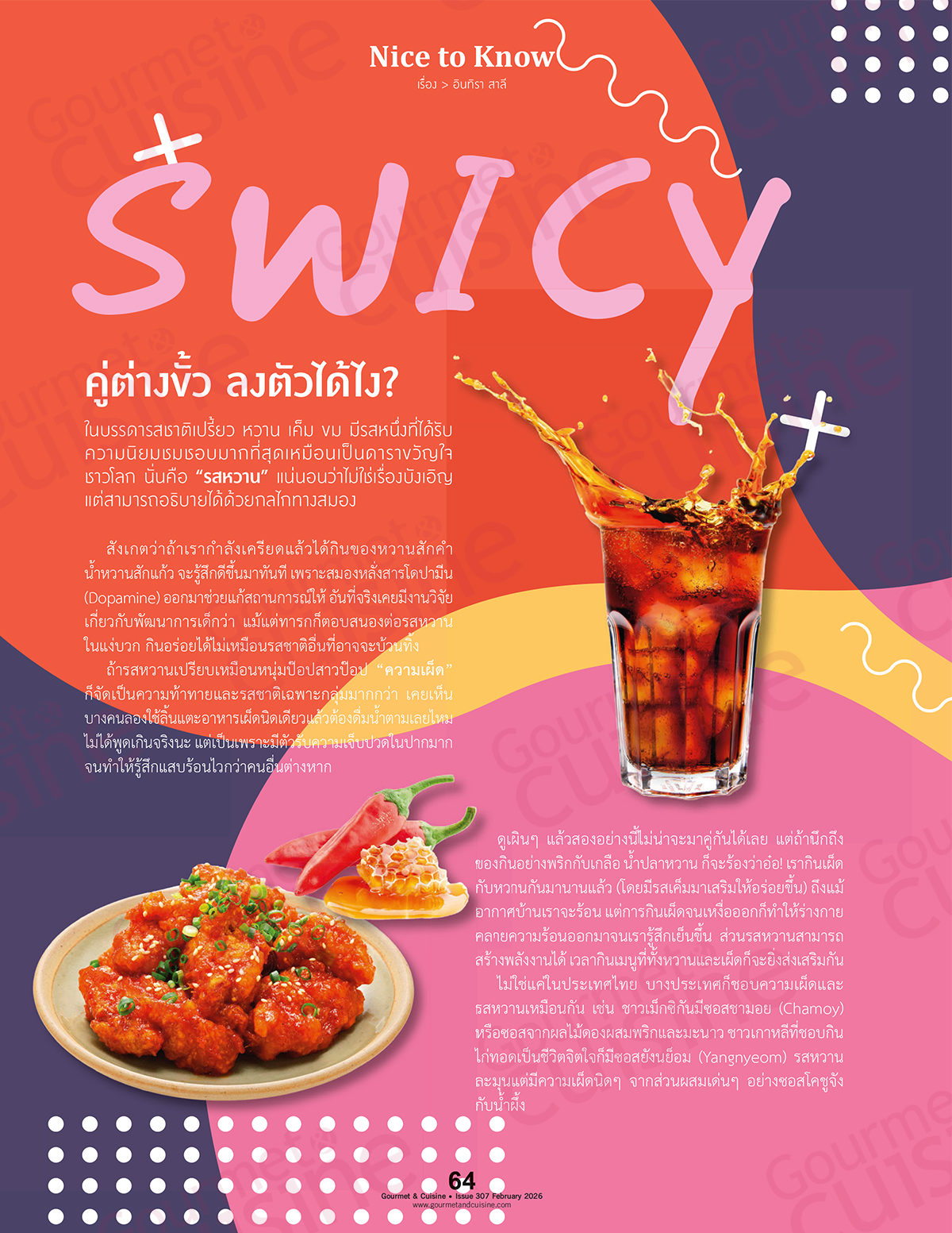Gourmet & Cuisine ฉบับเดือนกุมภาพันธ์ 2568 ต้อนรับเดือนแห่งความรักด้วยเรื่องราว EAT WELL, SWEET WELL คู่มือกินหวาน (กำลัง) ดี สำหรับคนรักสุขภาพที่ยังอยากมีความหวานอยู่ในชีวิต พาไปทำความรู้จัก “ความหวาน” ในหลากหลายมิติ ตั้งแต่บทบาทในการเสริมรสอาหาร การช่วยบูสต์อารมณ์ ไปจนถึงผลต่อร่างกาย ติดตามเรื่องราวทั้งหมดได้ใน COVER STORY